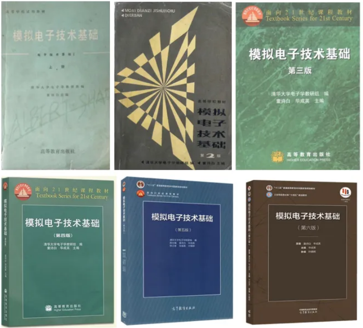 清华大学自动化系电子学教研组所编《模拟电子技术基础》,是我国高等院校有关课程首选教材之一,各版教材被近600所高校选用。教材第一版于1980年出版,由清华大学已故知名教授、我国电子学教学先辈童诗白先生主持编写,是国内最先出版的模拟电子技术教材,创建了该课程完整的内容体系。教材至今已由高等教育出版社发行六版。