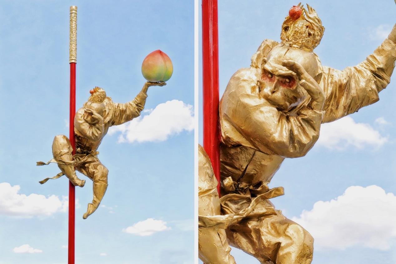美院雕塑系校友朱广介绍他的作品《躺平桃桃》时说:“这件作品是用平谷桃的元素制作出来的,具有互动性,小朋友和大人都可以躺在上面玩儿。”