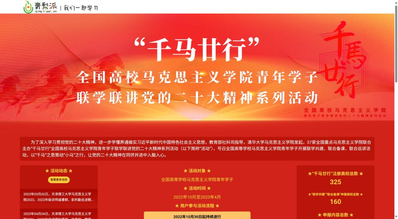 党的二十大召开以来,全国高校战线广泛组织动员,开展了形式多样的宣传宣讲活动,不断掀起师生学习贯彻党的二十大精神热潮。清华大学党委组织动员开展了一系列内容丰富、形式多样、生动活泼的宣讲活动。自2022年10月以来,在教育部社会科学司指导下,由清华大学马克思主义学院发起、37家全国重点马克思主义学院联合主办了“千马廿行”全国高校马克思主义学院青年学子联学联讲党的二十大精神系列活动,在全国高校马克思主义学院师生中间掀起学习宣传党的二十大精神和习近平新时代中国特色社会主义思想的热潮。