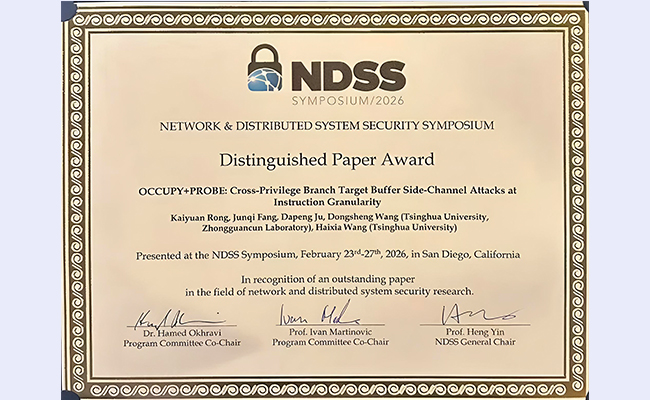 2026.03计算机系高性能所博士生获得第三十三届网络与分布式系统安全研讨会杰出论文奖