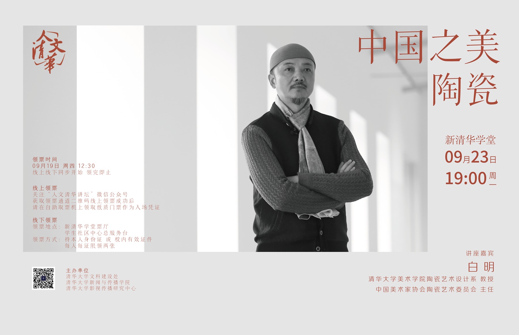 9月23日晚7点,人文清华讲坛,中国当代著名陶瓷艺术家、清华大学美术学院教授白明专场演讲《中国之美·陶瓷》带你走进陶瓷的前世今生,遥望历史现场,了解陶瓷背后的文明故事,认识陶瓷之中的文化传承,知道我们从哪里来,并更加坚定往哪里去。